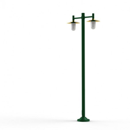 Description: Lampadaire 2 têtes MONTANA, E27, IP44, classe 1, diffuseurs verres dépolis. Mât, bras en aluminium Teinte RAL 6009 Vert anglais 019, dômes en cuivre vernis