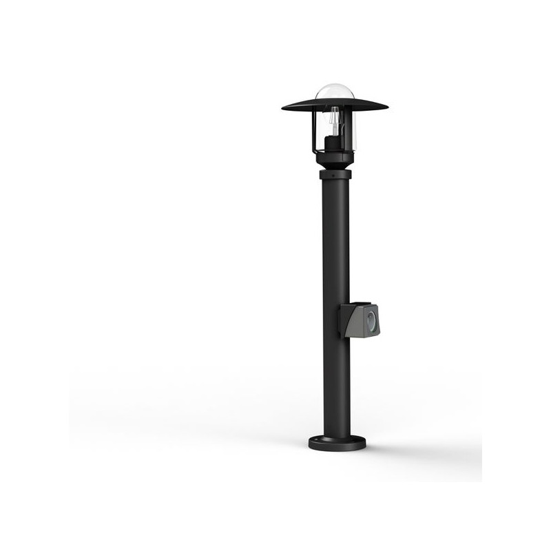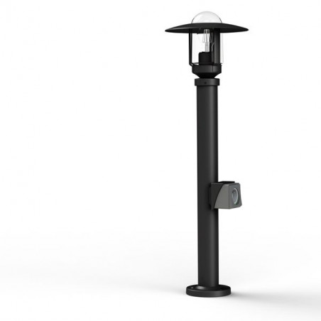 Borne NEWPARK en aluminium, avec prise, hauteur 855mm, E27, IP44, classe 1, diffuseur verre clair. Teinte RAL 9005 Noir foncé 000. Garantie 25 ans anticorrosion