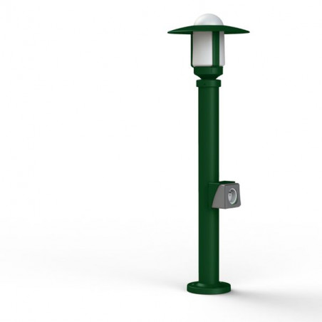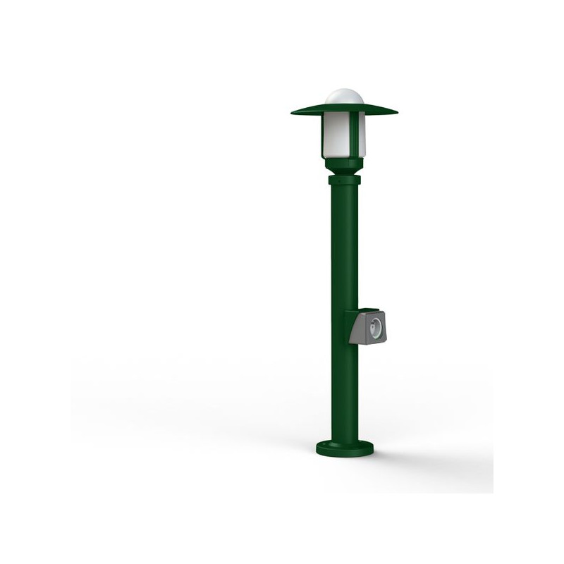 Description: Borne NEWPARK en aluminium, avec prise, hauteur 855mm, E27, IP44, classe 1, diffuseur verre dépoli. Teinte RAL 6009 Vert sapin 067. Garantie 25 ans anticorrosio