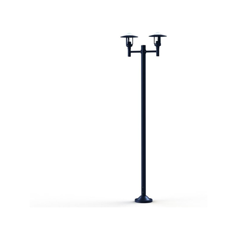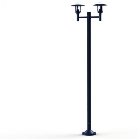 Description: Lampadaire 2 têtes bras droits NEWPARK en aluminium, E27, IP44, classe 1, diffuseurs verre clair. Teinte RAL 5011 Bleu acier 065. Garantie 25 ans anticorrosion