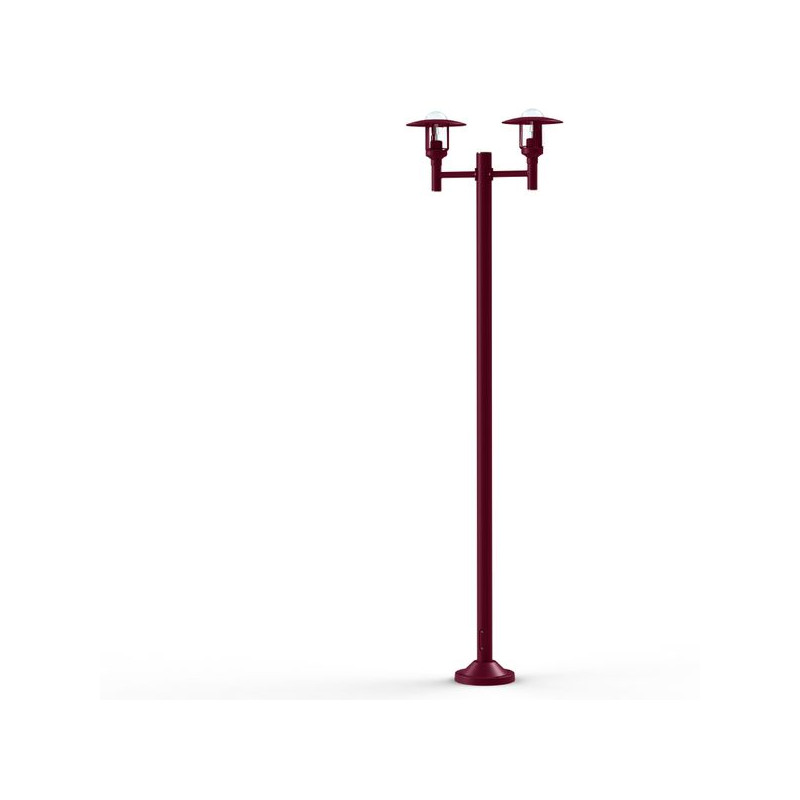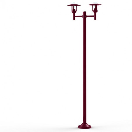 Description: Lampadaire 2 têtes bras droits NEWPARK en aluminium, E27, IP44, classe 1, diffuseurs verre clair. Teinte RAL 3005 Rouge vin 066. Garantie 25 ans anticorrosion s