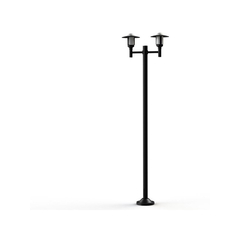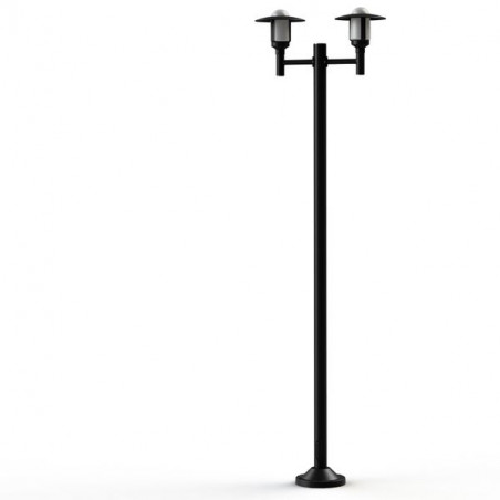 Description: Lampadaire 2 têtes bras droits NEWPARK en aluminium, E27, IP44, classe 1, diffuseurs verre dépoli. Teinte RAL 5011 Bleu acier 065. Garantie 25 ans anticorrosion