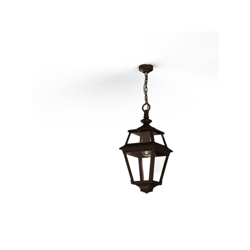 Description: Suspension chaîne PLACE DES VOSGES 2 en aluminium, E27, IP44, classe 1, diffuseurs verre clair. Teinte Rouille 046. Garantie 25 ans anticorrosion sur l'aluminiu