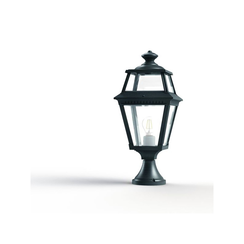 Description: Borne PLACE DES VOSGES 2 en aluminium, hauteur 550mm, E27, IP44, classe 1, diffuseurs verre clair. Finition Patine vert de gris 008. Garantie 25 ans anticorrosi