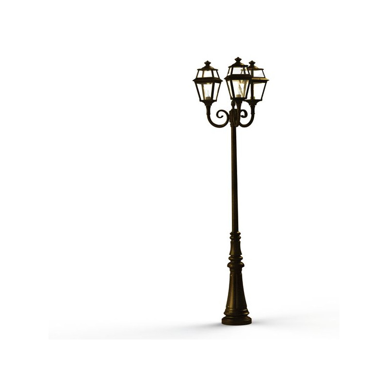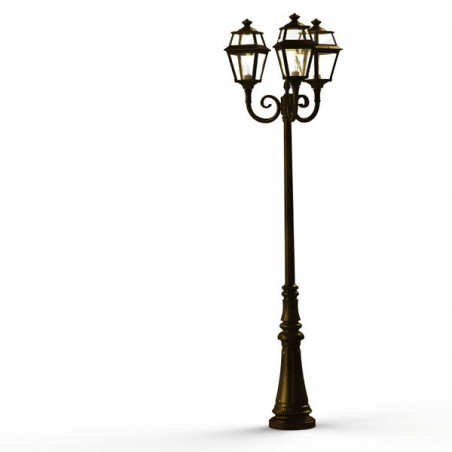 Description: Lampadaire 3 têtes PLACE DES VOSGES 2 en aluminium, hauteur 2617mm, E27, IP44, classe 1, diffuseurs verre clair. Finition Patine dorée 009. Garantie 25 ans anti