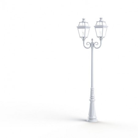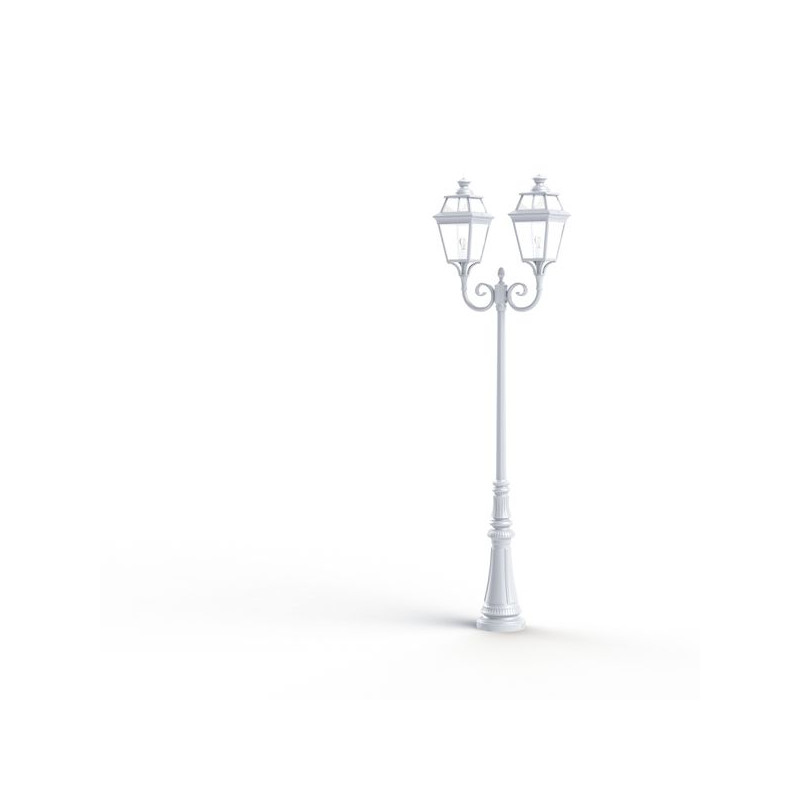 Description: Lampadaire 2 têtes PLACE DES VOSGES 3 en aluminium, E27, IP44, classe 1, diffuseurs verre clair. Teinte Blanc 001. Garantie 25 ans anticorrosion sur l'aluminium