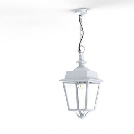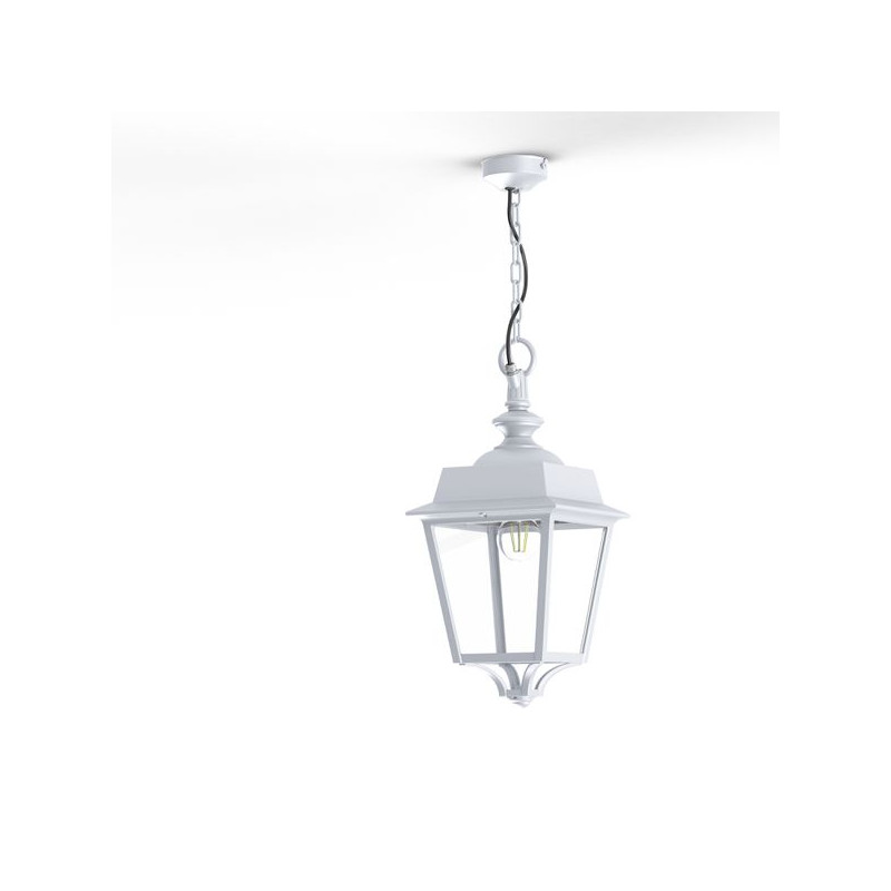 Description: Suspension chaîne PLACE DES VOSGES EVOLUTION en aluminium, E27, IP65, classe 1, bloc diffuseur méthacrylate clair. Teinte Blanc 001. Garantie 25 ans anticorrosi