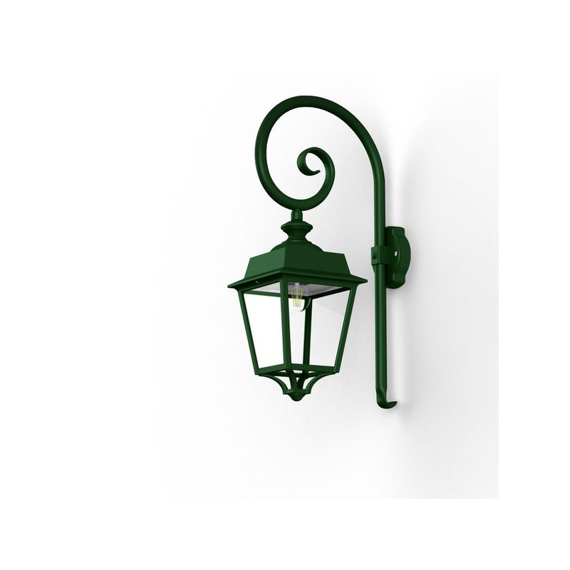 Description: Applique crosse PLACE DES VOSGES EVOLUTION en aluminium, E27, IP65, classe 1, bloc diffuseur méthacrylate clair. Teinte RAL 6009 Vert anglais 019. Garantie 25 a