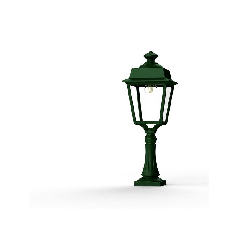 Borne PLACE DES VOSGES EVOLUTION en aluminium, hauteur 627mm, E27, IP65, classe 1, bloc diffuseur méthacrylate clair. Teinte RAL 6009 Vert anglais 019. Garantie
