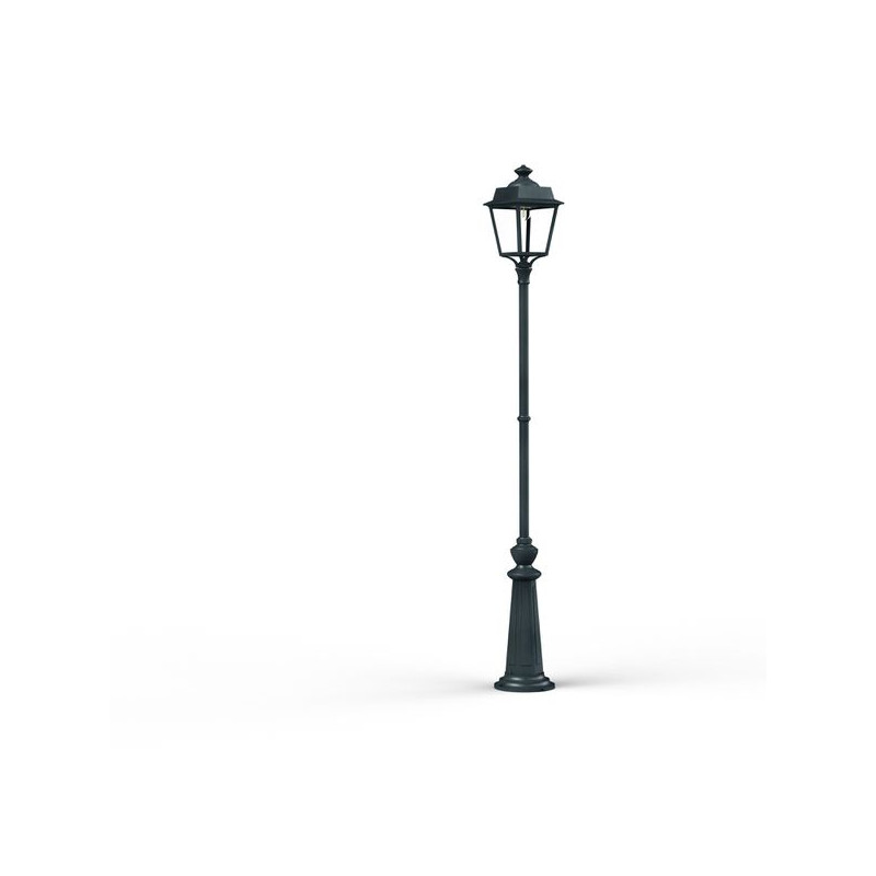 Description: Lampadaire 1 tête PLACE DES VOSGES EVOLUTION en aluminium, E27, IP65, classe 1, bloc diffuseur méthacrylate clair. Finition Patine vert de gris 008. Garantie 25