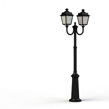 Description: Lampadaire 2 têtes PLACE DES VOSGES EVOLUTION en aluminium, télescopique, E27, IP65, classe 1, blocs diffuseurs méthacrylate opale. Teinte RAL 9005 Noir foncé 0