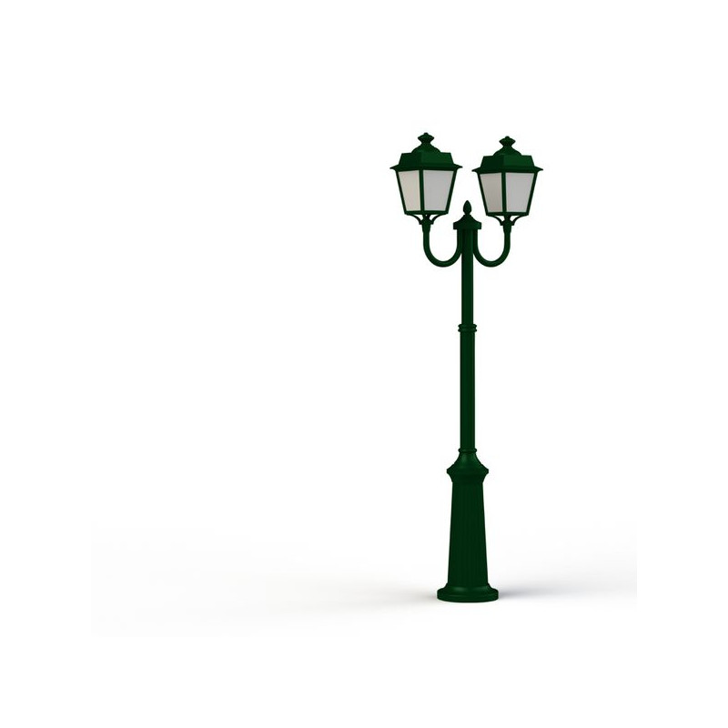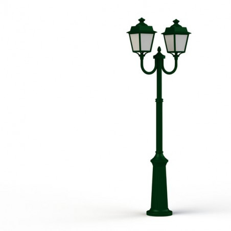Lampadaire 2 têtes PLACE DES VOSGES EVOLUTION en aluminium, télescopique, E27, IP65, classe 1, blocs diffuseurs méthacrylate opale. Teinte RAL 6009 Vert sapin 0