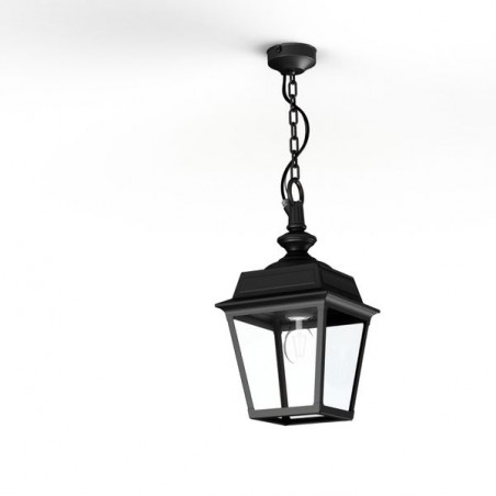 Description: Suspension chaîne PLACE DES VOSGES TRADITION en aluminium, E27, IP44, classe 1, diffuseurs verre clair. Teinte RAL 9005 Noir foncé 000. Garantie 25 ans anticorr