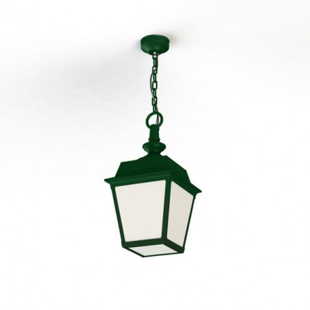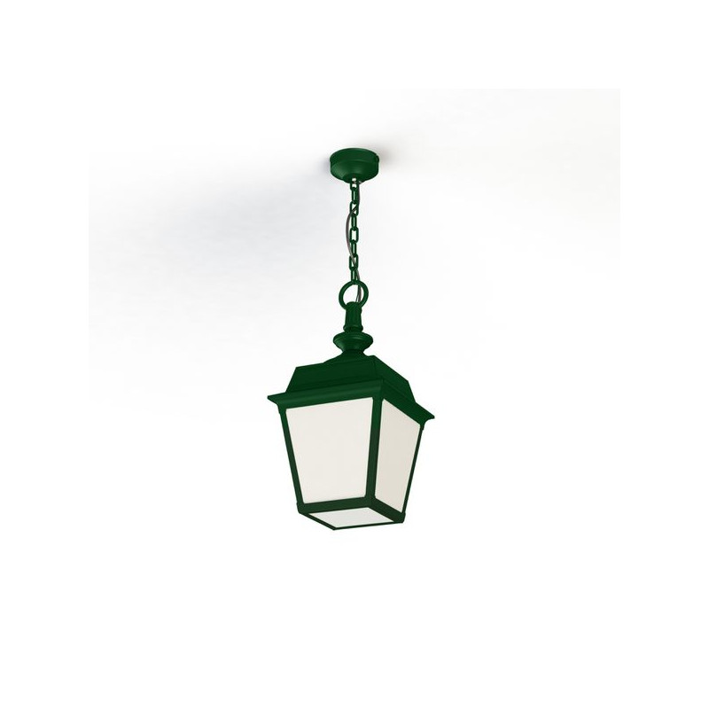 Description: Suspension chaîne PLACE DES VOSGES TRADITION en aluminium, E27, IP44, classe 1, diffuseurs verre opale. Teinte RAL 6009 Vert sapin 067. Garantie 25 ans anticorr