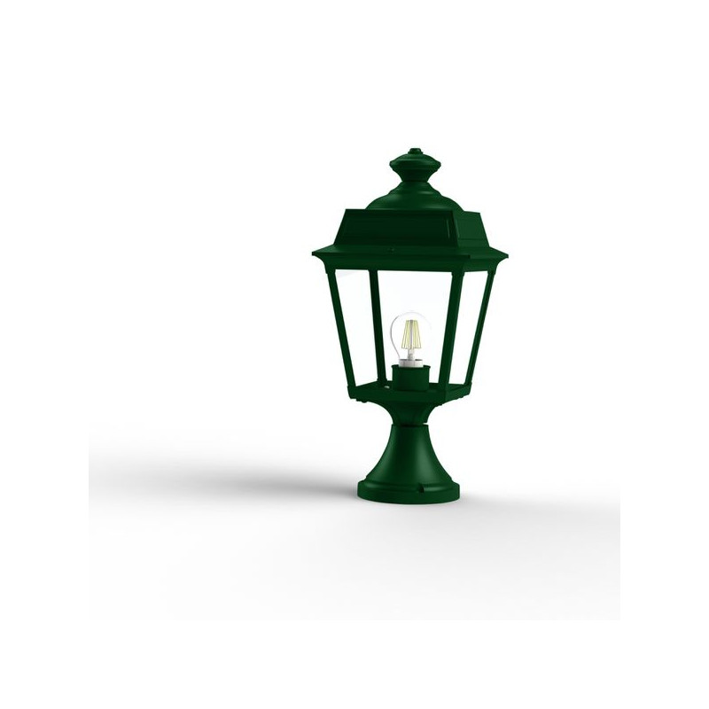 Description: Borne PLACE DES VOSGES TRADITION en aluminium, hauteur 473mm, E27, IP44, classe 1, diffuseurs verre clair. Teinte RAL 6009 Vert sapin 067. Garantie 25 ans antic