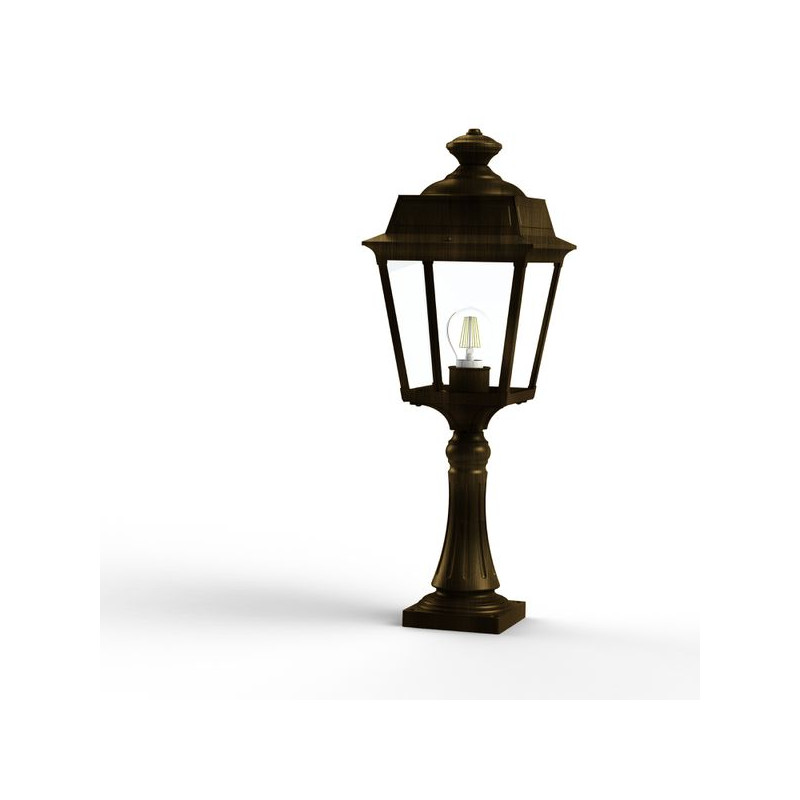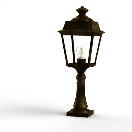 Description: Borne PLACE DES VOSGES TRADITION en aluminium, hauteur 616mm, E27, IP44, classe 1, diffuseurs verre clair. Finition Patine dorée 009. Garantie 25 ans anticorros