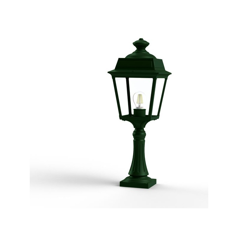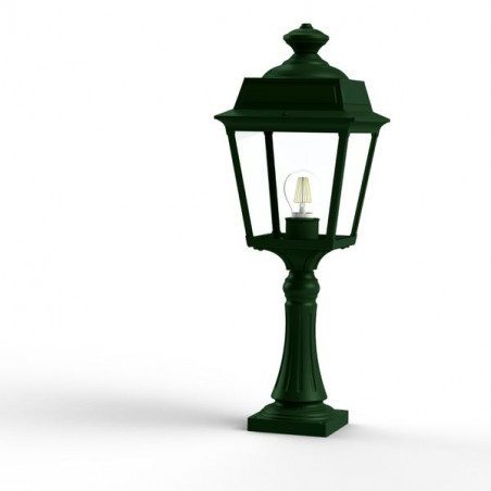 Description: Borne PLACE DES VOSGES TRADITION en aluminium, hauteur 616mm, E27, IP44, classe 1, diffuseurs verre clair. Teinte RAL 6009 Vert anglais 019. Garantie 25 ans ant