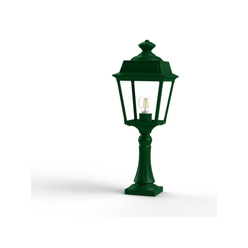 Borne PLACE DES VOSGES TRADITION en aluminium, hauteur 616mm, E27, IP44, classe 1, diffuseurs verre clair. Teinte RAL 6009 Vert sapin 067. Garantie 25 ans antic