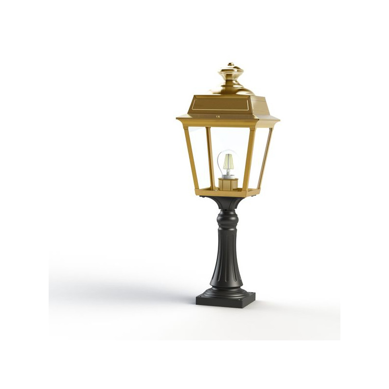 Description: Borne PLACE DES VOSGES TRADITION, hauteur 616mm, E27, IP44, classe 1, diffuseurs verre clair. Matière lanterne : laiton vernis teinté 070. Matière borne : alumi