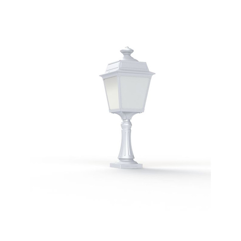 Description: Borne PLACE DES VOSGES TRADITION en aluminium, hauteur 616mm, E27, IP44, classe 1, diffuseurs verre opale. Teinte Blanc 001. Garantie 25 ans anticorrosion sur l