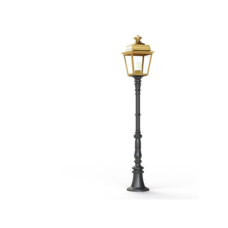 Description: Borne PLACE DES VOSGES TRADITION, hauteur 1296mm, E27, IP44, classe 1, diffuseurs verre clair. Matière lanterne : laiton vernis teinté 070. Matière borne : alum