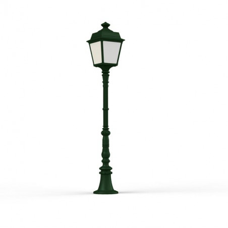 Borne PLACE DES VOSGES TRADITION, hauteur 1296mm, en aluminium, E27, IP44, classe 1, diffuseurs verre opale. Teinte RAL 6009 Vert anglais 019. Garantie 25 ans a