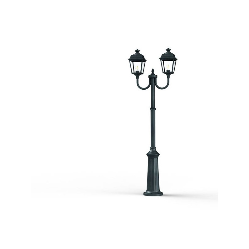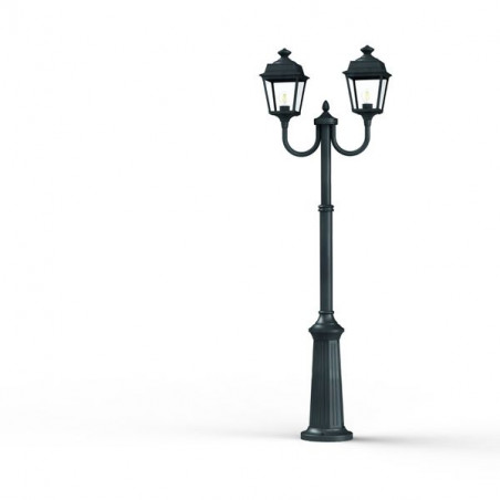 Description: Lampadaire 2 têtes PLACE DES VOSGES TRADITION, hauteur 1977mm, en aluminium, télescopique, E27, IP44, classe 1, diffuseurs verre clair. Finition Patine vert de