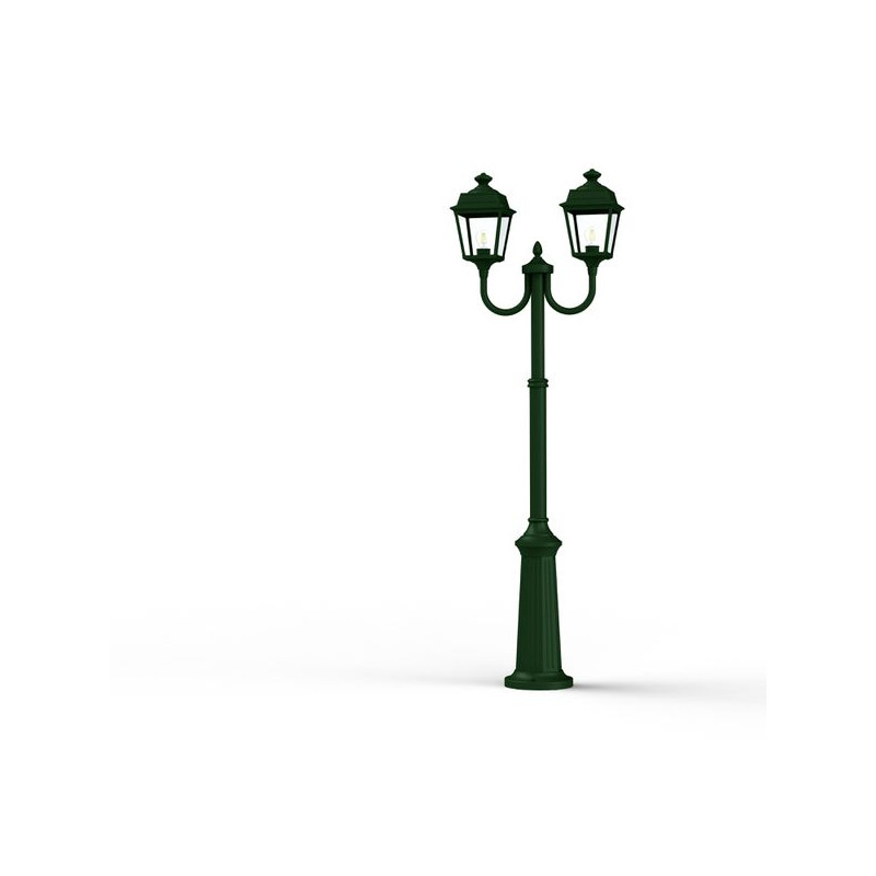 Description: Lampadaire 2 têtes PLACE DES VOSGES TRADITION, hauteur 1977mm, en aluminium, télescopique, E27, IP44, classe 1, diffuseurs verre clair. Teinte RAL 6009 Vert ang