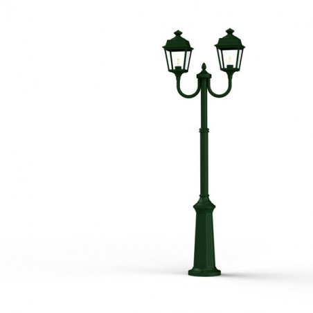 Lampadaire 2 têtes PLACE DES VOSGES TRADITION, hauteur 1977mm, en aluminium, télescopique, E27, IP44, classe 1, diffuseurs verre clair. Teinte RAL 6009 Vert ang