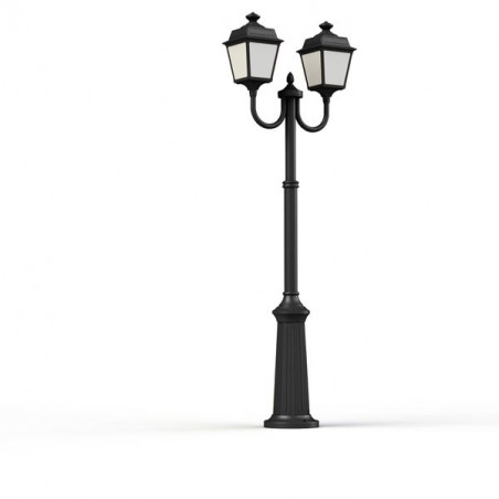 Description: Lampadaire 2 têtes PLACE DES VOSGES TRADITION, hauteur 1977mm, en aluminium, télescopique, E27, IP44, classe 1, diffuseurs verre opale. Teinte RAL 9005 Noir fon