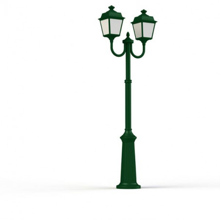 Description: Lampadaire 2 têtes PLACE DES VOSGES TRADITION, hauteur 1977mm, en aluminium, télescopique, E27, IP44, classe 1, diffuseurs verre opale. Teinte RAL 6009 Vert sap