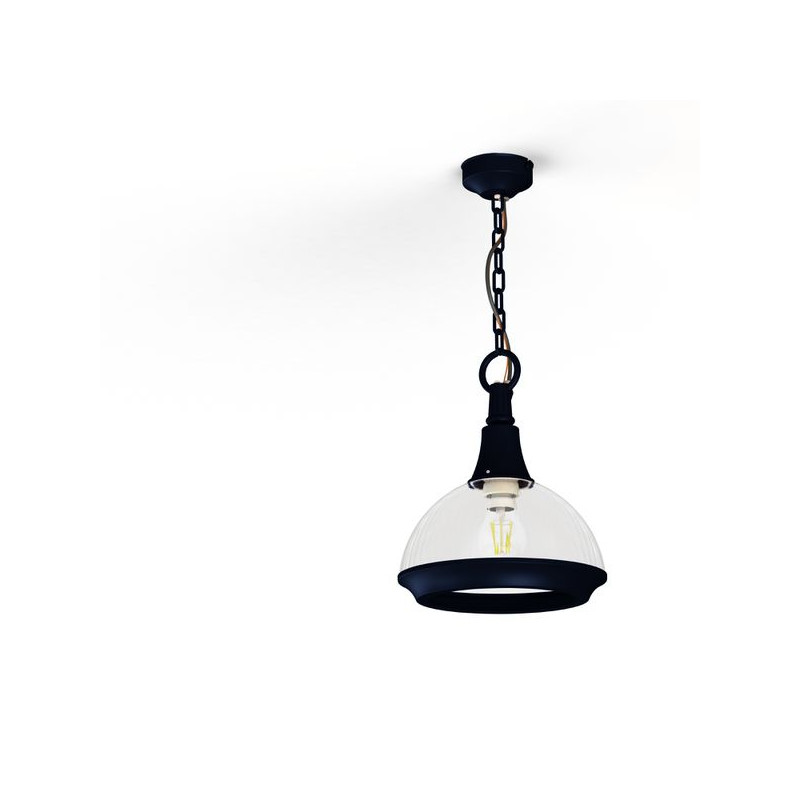 Description: Suspension chaîne BOLERO en aluminium, E27, IP23, classe 1, diffuseur verre clair prismatique. Teinte RAL 5011 Bleu acier 065. Garantie 25 ans anticorrosion sur
