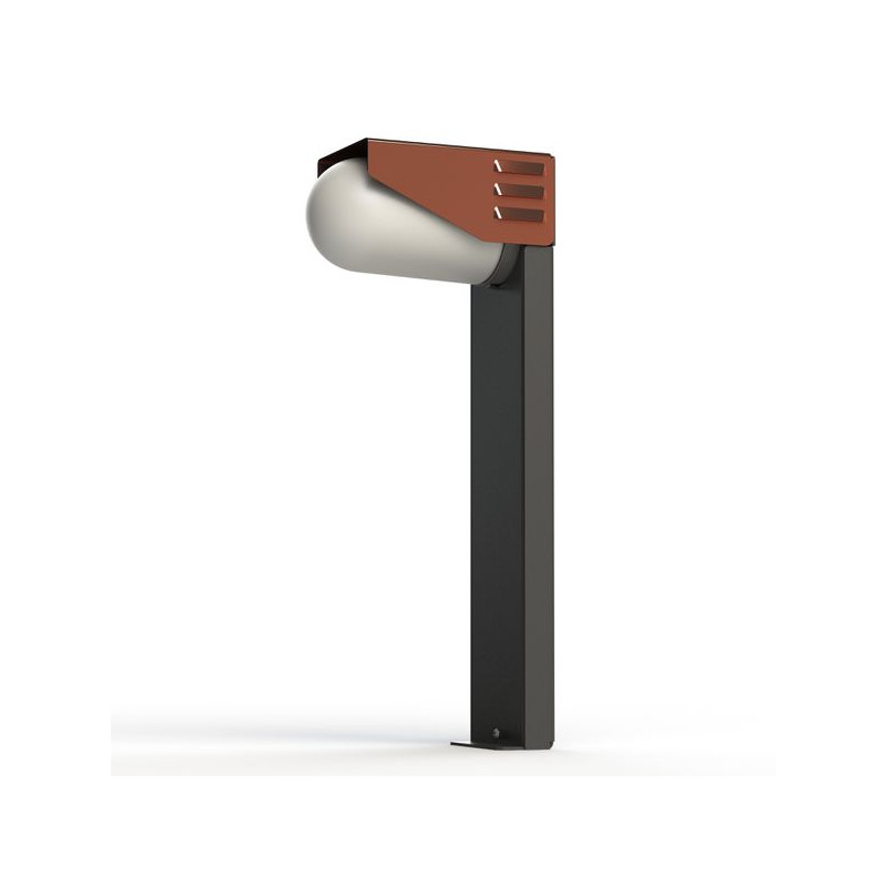 Description: Borne RP195, hauteur 602mm, E27, IP65, classe 2, diffuseur verre dépoli. Matière tête : cuivre brut 082. Matière Borne : aluminium, teinte RAL 9005 Noir foncé 0