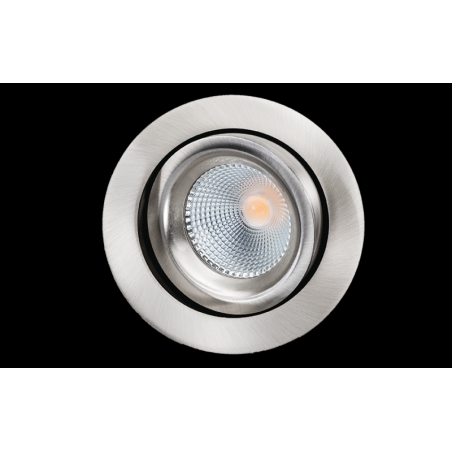 Description: Downlight, LED intérieur plafonnier downlight, acier brossé, 8W, 2700K. inclinable 30 degrés dans toutes les directions, driver incl., dimmable coupure de phase. découpe 83 mm. Mat.: aluminium, verre transparent. Classe III, IP44, faisceau 42 degrés, Ra>95, SDCM 2