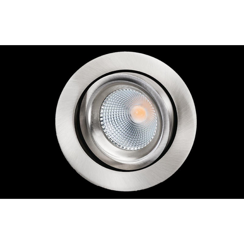 Description: Downlight, LED intérieur plafonnier downlight, acier brossé, 8W, 4000K. inclinable 30 degrés dans toutes les directions, driver incl., dimmable coupure de phase. découpe 83 mm. Mat.: aluminium, verre transparent. Classe III, IP44, faisceau 42 degrés, Ra>95, SDCM 2