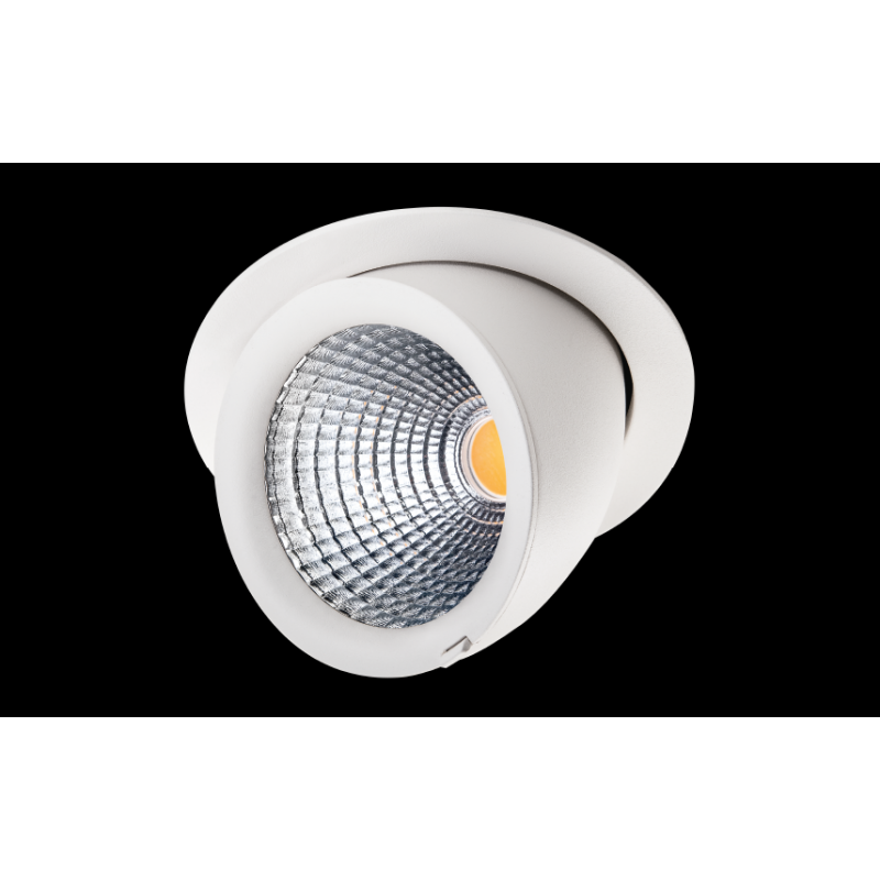 Description: Downlight, LED in-en extérieur plafonnier downlight, blanc, 31W, 3000K. inclinable dans une direction. Driver incl., dimmable coupure de phase. matériau: aluminium, verre transparent. classe II, IP44, faisceau 40 degrés, Ra>90, SDCM 2, 2140 lm