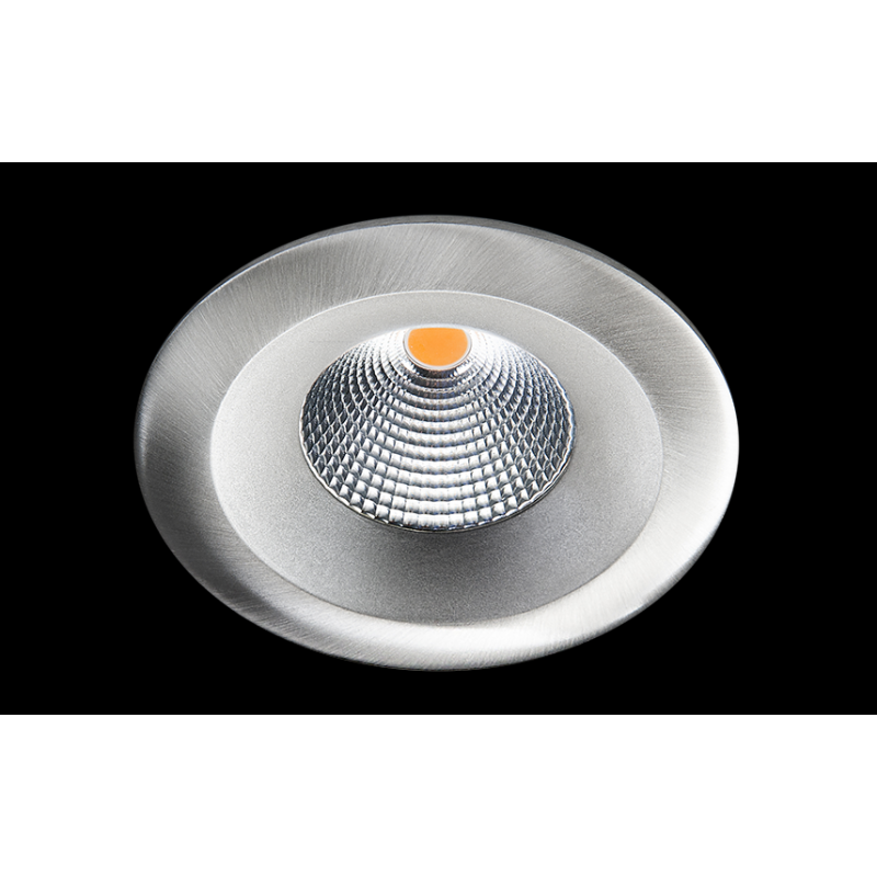 Description: Downlight, Led intérieur plafonnier downlight, acier brossé, 7W, 3000K. pas inclin. Driver incl., dimmable coupure de phase. découpe 83 mm. mat.: alu., verre transp. Classe II, IP54, faisceau 42 degrés, Ra>95, SDCM 2, 680 lm