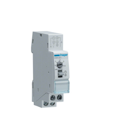 Emballage: 1 - 6 - 144 - 3456 Marque: HagerRéférence: EMN001EAN: 3250612339969Description: Minuterie simple temporisation 1 module