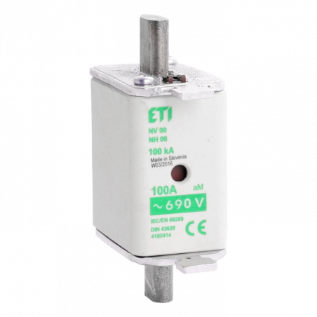 Emballage: 3 - 45Marque: ETIRéférence: 004182414EAN: 5904722947108Description: Fusible à couteaux taille 00 aM 100Ahttps://teconex.eu/fr/produit/9668b16e-5146-f049-a617-e2edfed71c31