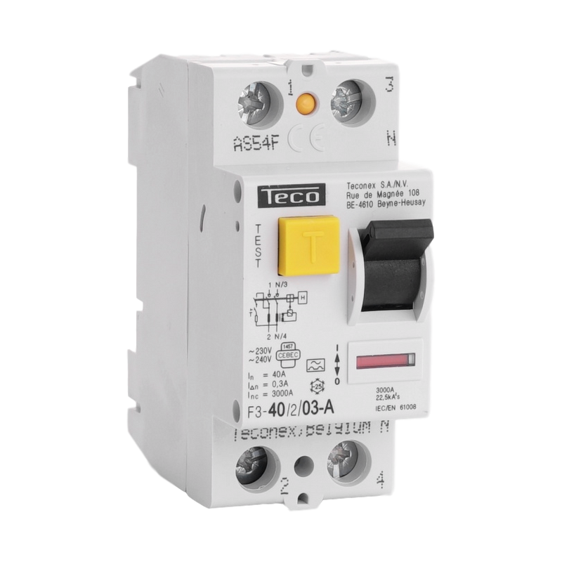 Emballage: 1 - 60Marque: TeconexRéférence: F340203AEAN: 4015081810437Description: Inter. diff. Teco 2P 40A 300mA Type A 3kAhttps://teconex.eu/fr/produit/d9b0ac1a-8bbb-f34d-b860-c2533d48d49b