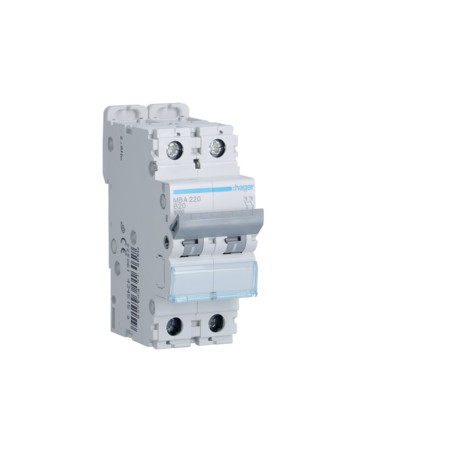 Emballage: 1 - 6 - 72 - 1728 Marque: HagerRéférence: MBA220EAN: 3250614345159Description: Disjoncteur 6kA - B - 2P - 20A - 2M.