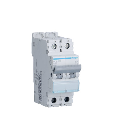 Emballage: 1 - 6 - 72 - 1728 Marque: HagerRéférence: MCA250EAN: 3250614346699Description: Disjoncteur 6kA - C - 2P - 50A - 2M.