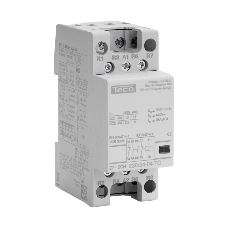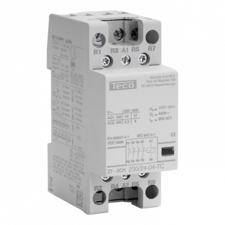 Emballage: Marque: TeconexRéférence: Z7SCH2302404EAN: 4015082856595Description: Contacteur Teco 230VAC 25A 4NFhttps://teconex.eu/fr/produit/9aa7b8a3-bd01-8842-a64f-086747a20697