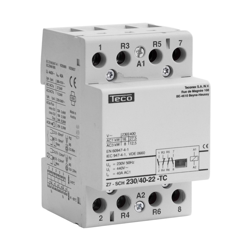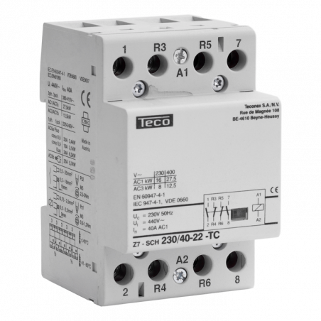 Emballage: Marque: TeconexRéférence: Z7SCH2304022EAN: 4015082857325Description: Contacteur Teco 230VAC 40A 2NO+2NFhttps://teconex.eu/fr/produit/050ae62f-52a3-e341-835b-36ae192fc381