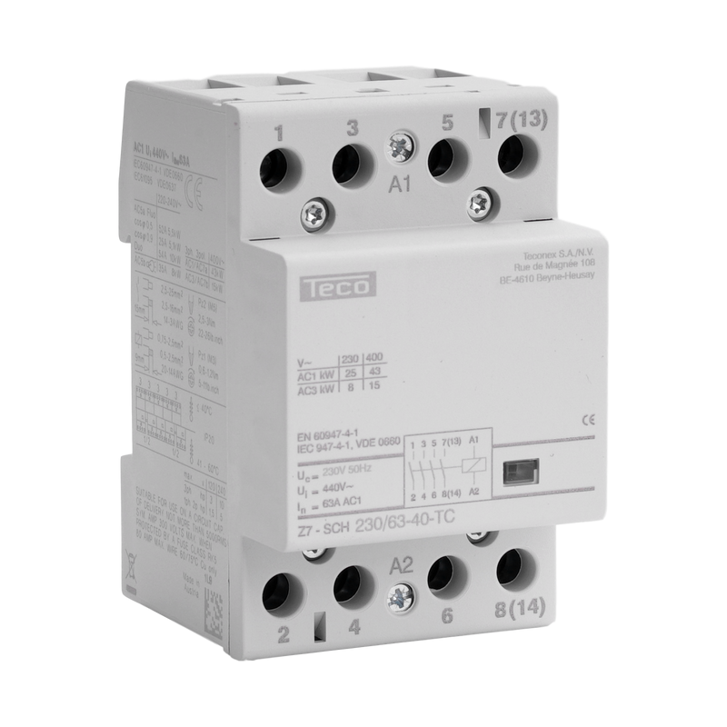 Emballage: Marque: TeconexRéférence: Z7SCH2306340EAN: 4015082857332Description: Contacteur Teco 230VAC 63A 4NOhttps://teconex.eu/fr/produit/cc09f211-d51a-ef4d-9226-189c58abb59e