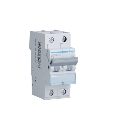 Emballage: 1 - 6 - 72 - 1728 Marque: HagerRéférence: MWN210AEAN: 3250614341663Description: Disjoncteur 3kA - C - 2P - 10A - 2M.