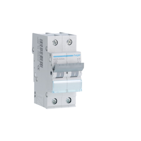 Emballage: 1 - 6 - 72 - 1728 Marque: HagerRéférence: MWN225AEAN: 3250614341700Description: Disjoncteur 3kA - C - 2P - 25A - 2M.