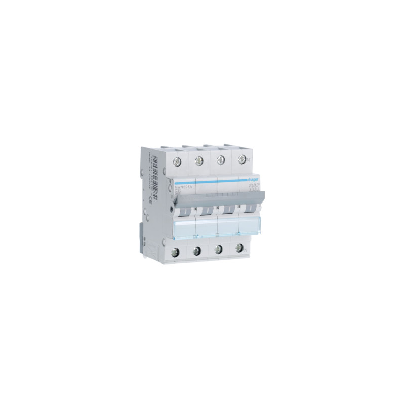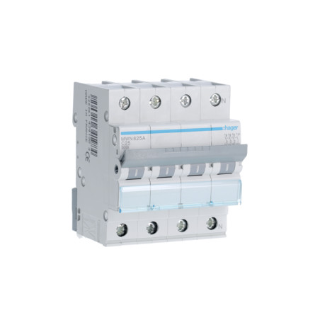 Emballage: 1 - 3 - 36 - 864 Marque: HagerRéférence: MWN625AEAN: 3250614341984Description: Disjoncteur 3kA - C - 3P+N - 25A - 4M.