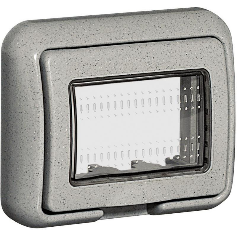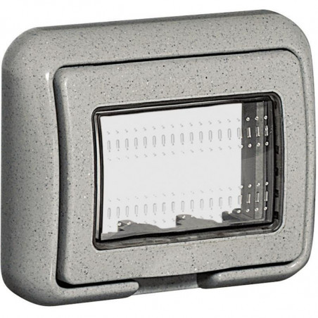 Description: Plaque de recouvrement avec couvercle Idrobox IP 55 - 3 modules horizontaux - pour apareillage Living/Light/Light Tech en boîte