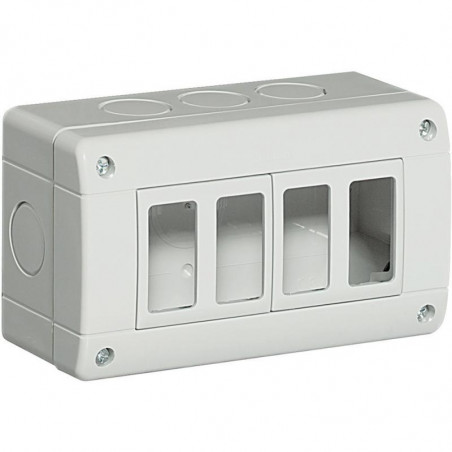 Description: Boîtier saillie Idrobox IP 40 - 4 modules horizontaux - 9 entrées défonçables diam. 23 mm - gris